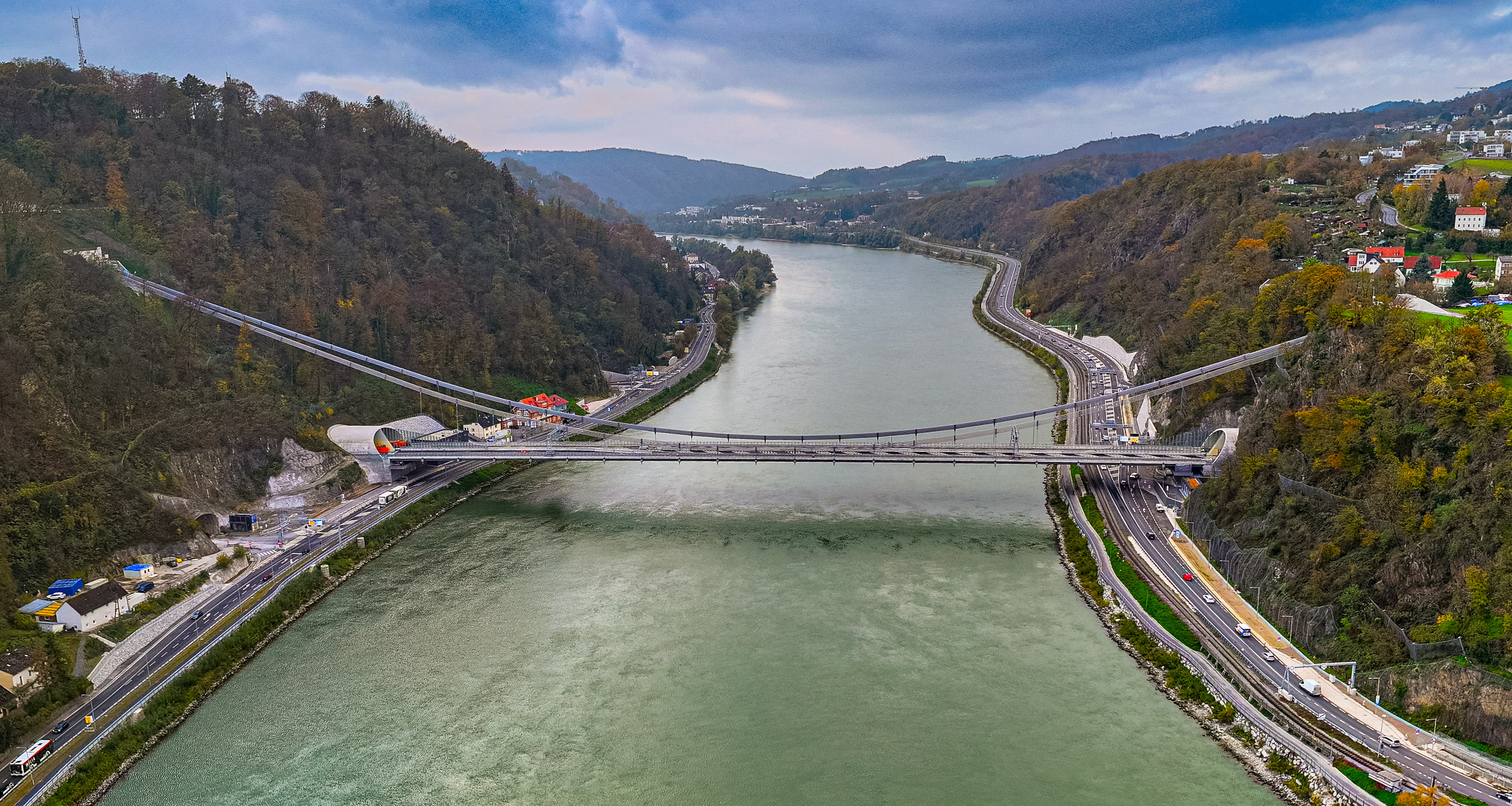 Der erste Bauabschnitt der A 26 ist die neue Linzer Donautalbrücke mit den Auf- und Abfahrten zur B 127 Rohrbacherstraße und zur B 129 Eferdingerstraße. Diese Anschlüsse an das Landesstraßennetz befinden sich vollständig im Tunnel. Die Hängebrücke besteht aus einem sogenannten Tragwerk für beide Richtungsfahrbahnen – ist also „aus einem Guss“. Die zwei horizontalen Hauptseile über die Donau, die das Brückengewicht von 13.000 Tonnen tragen, sind 500 Meter lang und wiegen jeweils 85 Tonnen. Jedes Hauptseil besteht wiederum aus einem Bündel von zwölf einzelnen Seilen. Die kleineren Hängeseile, die die Tragseile mit der Fahrbahn verbinden, haben zueinander einen Abstand von 15 Metern.