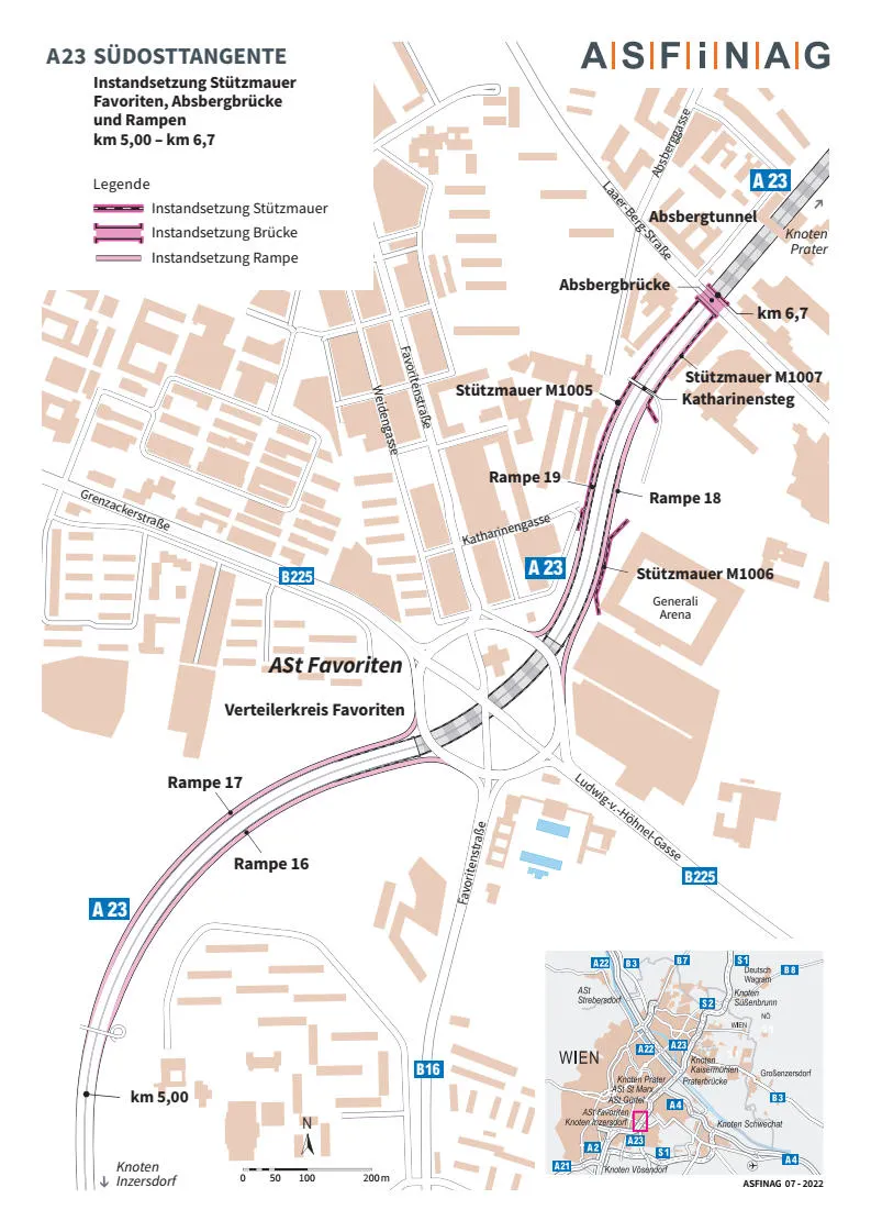 Für die Abbrucharbeiten an der Stützmauer in Fahrtrichtung Altmannsdorf muss die Abfahrt von der A 23 zum Verteilerkreis Favoriten für zwei Wochen im Zeitraum vom 7. Juli, 22:00 Uhr bis 21. Juli 2025, 5:00 Uhr gesperrt werden. Nach der zweiwöchigen Abbruchphase findet der Wiederaufbau aufgrund der größeren Arbeitsmaschinen nur nachts statt, da aufgrund der hohen Verkehrsbelastung auf der A 23 alle Fahrspuren aufrechterhalten werden müssen. In der Nacht wird dann auf eine Fahrspur verengt und die Abfahrt Richtung Favoriten gesperrt.