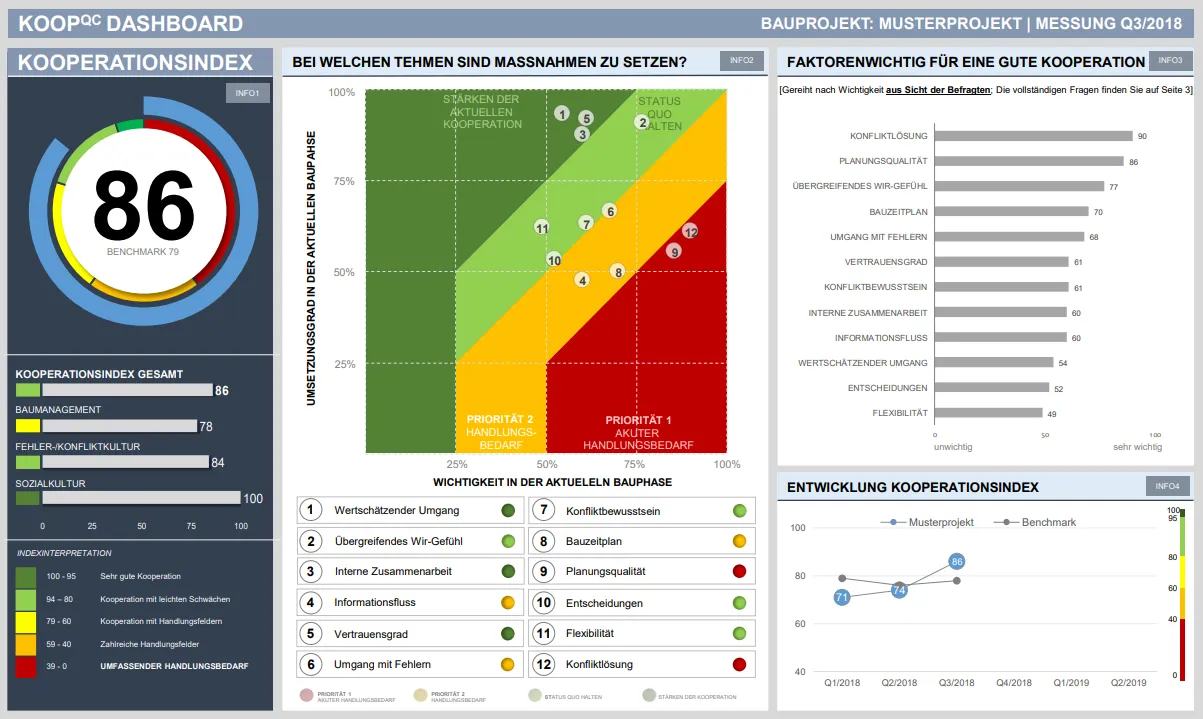 Mit dem Analysetool KOOPqc – KOOPQuickCheck kann einmal pro Quartal eine anonyme Befragung innerhalb des Projektteams durchgeführt werden, die Ergebnisse bekommt ausschließlich das Projektteam und kann damit selbst Maßnahmen zur Verbesserung setzen. Die Kosten werden üblicherweise zwischen Auftraggeber und AN Bau geteilt.