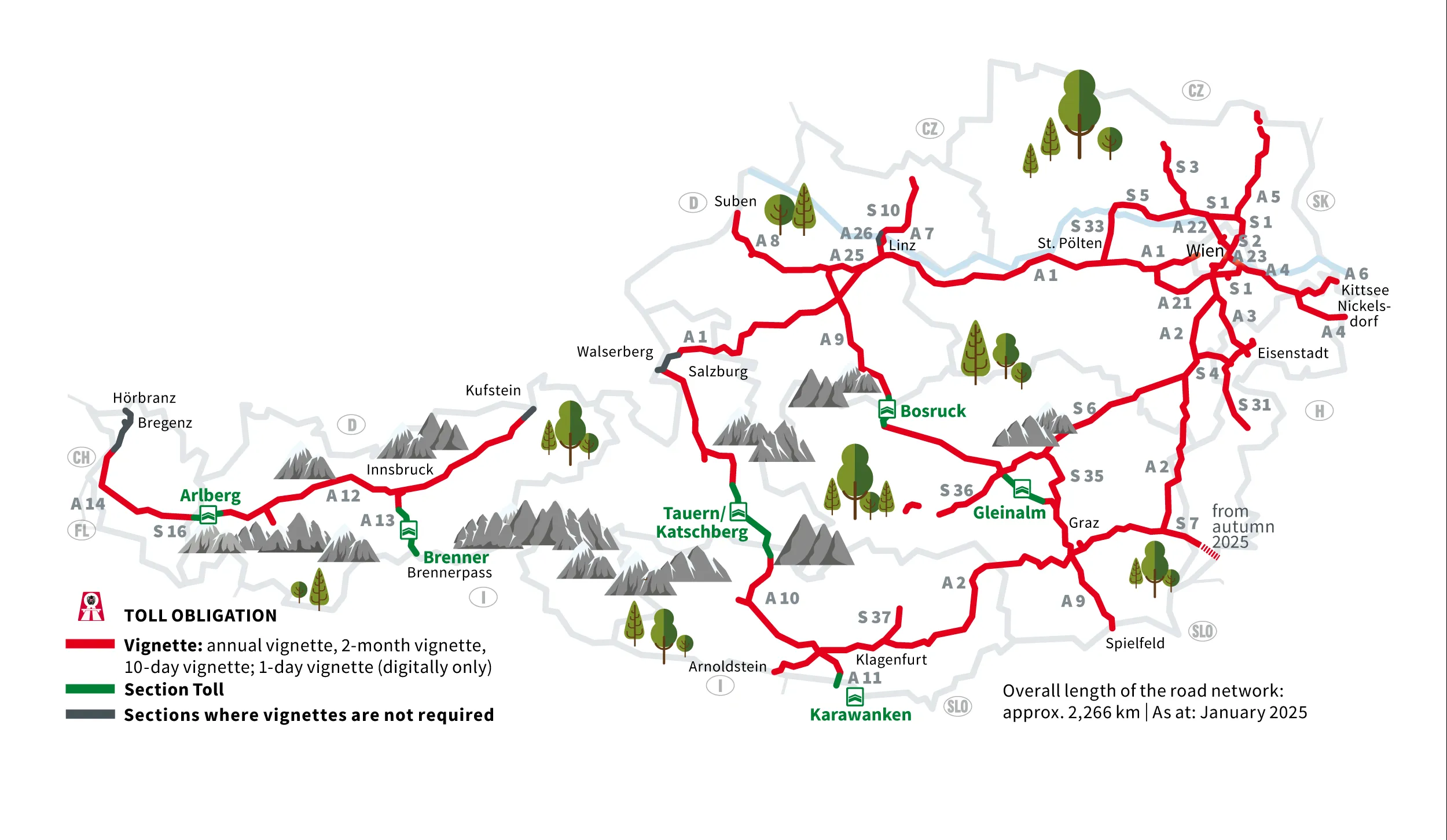 The toll sticker has been compulsory on Austria's motorways and expressways since 1997.All cars, motorbikes and camper vans up to 3.5 tons technically permissible maximum laden mass (TPMLM*) must properly display a toll sticker or have purchased online in time a digital vignette when they drive onto a motorway or expressway.