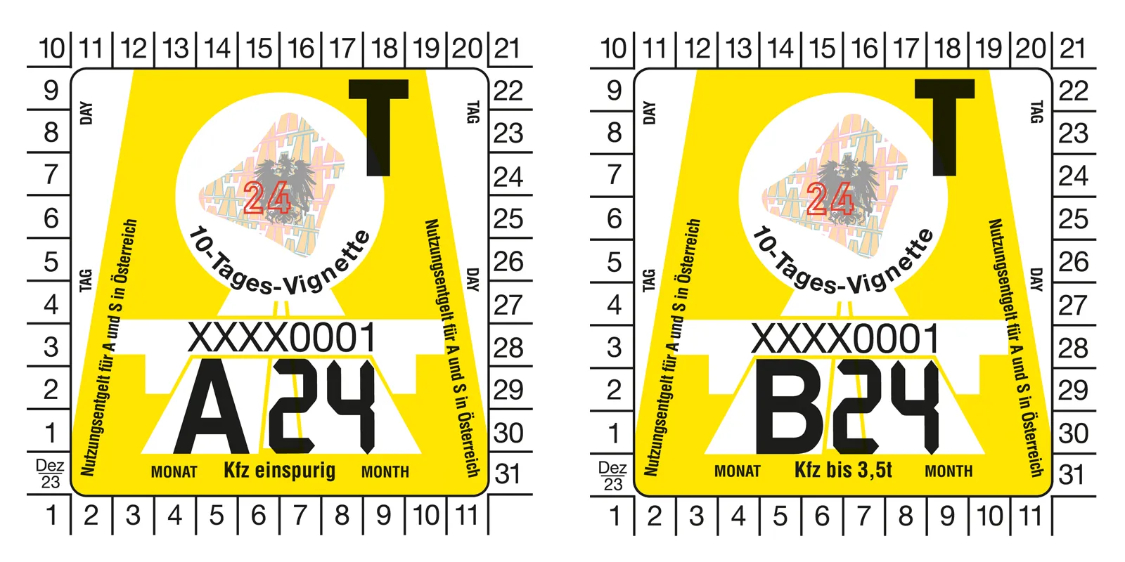 The 10-day toll sticker allows a vehicle of up to 3.5 tons technically permissible maximum laden mass (TPMLM) to use the roads during a period of ten consecutive calendar days. The punch day (Lochungstag) is the first day.