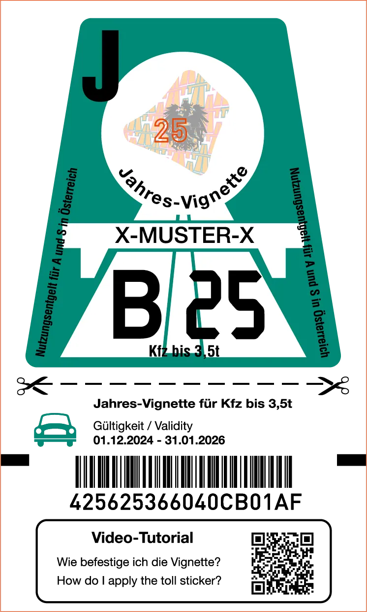 - Also part of the hologram: The year "e.g. 25" refers to the toll sticker's period of validity from 1 December 2024 until 31 January 2026.