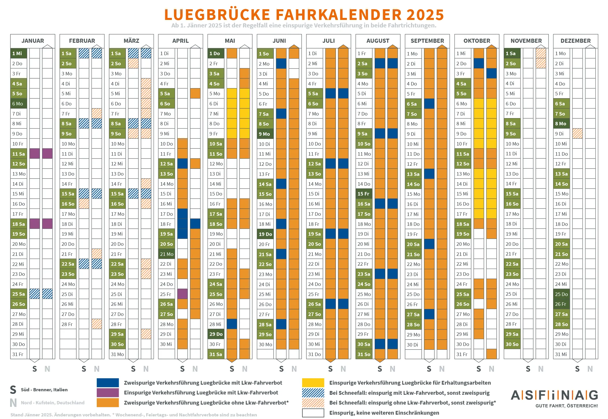 mit allen Maßnahmen und EinschränkungenDie ASFINAG hat zusammen mit dem Land Tirol und dem Ministerium einen Fahrkalender (Lkw-Fahrverbote für Fahrzeuge über 7,5 t bis hin zu Verkehrsführungen) entwickelt, um Frächtern, Touristikern, Busunternehmen und allen Verkehrsteilnehmenden eine optimale Planung für die Fahrten über die Brennerautobahn zu ermöglichen.