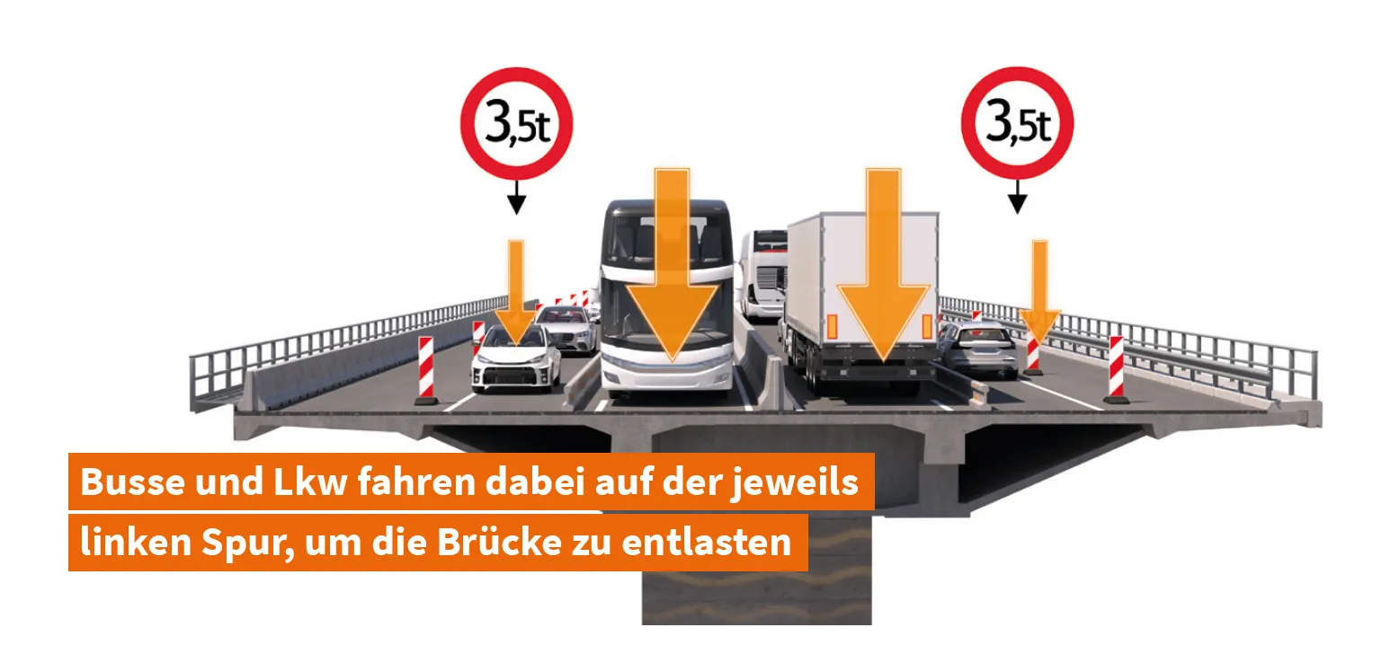 Ein Befahren der rechten Spur durch Fahrzeuge über 3,5 Tonnen muss während der Zweispurigkeit aus statischen Gründen komplett vermieden werden. Das garantiert ein Kontrollsystem auf der rechten Fahrspur. Eine in die Fahrbahn integrierte Waage erkennt während der Fahrt, ob noch ein Fahrzeug über 3,5 Tonnen fälschlicherweise auf der rechten Spur fährt. In diesem Fall wird dieses Fahrzeug noch vor der Brücke abgeleitet, über einen Parkplatz gelotst, dort nochmals gecheckt und im Anschluss auf die korrekte, linke Fahrspur geleitet.
