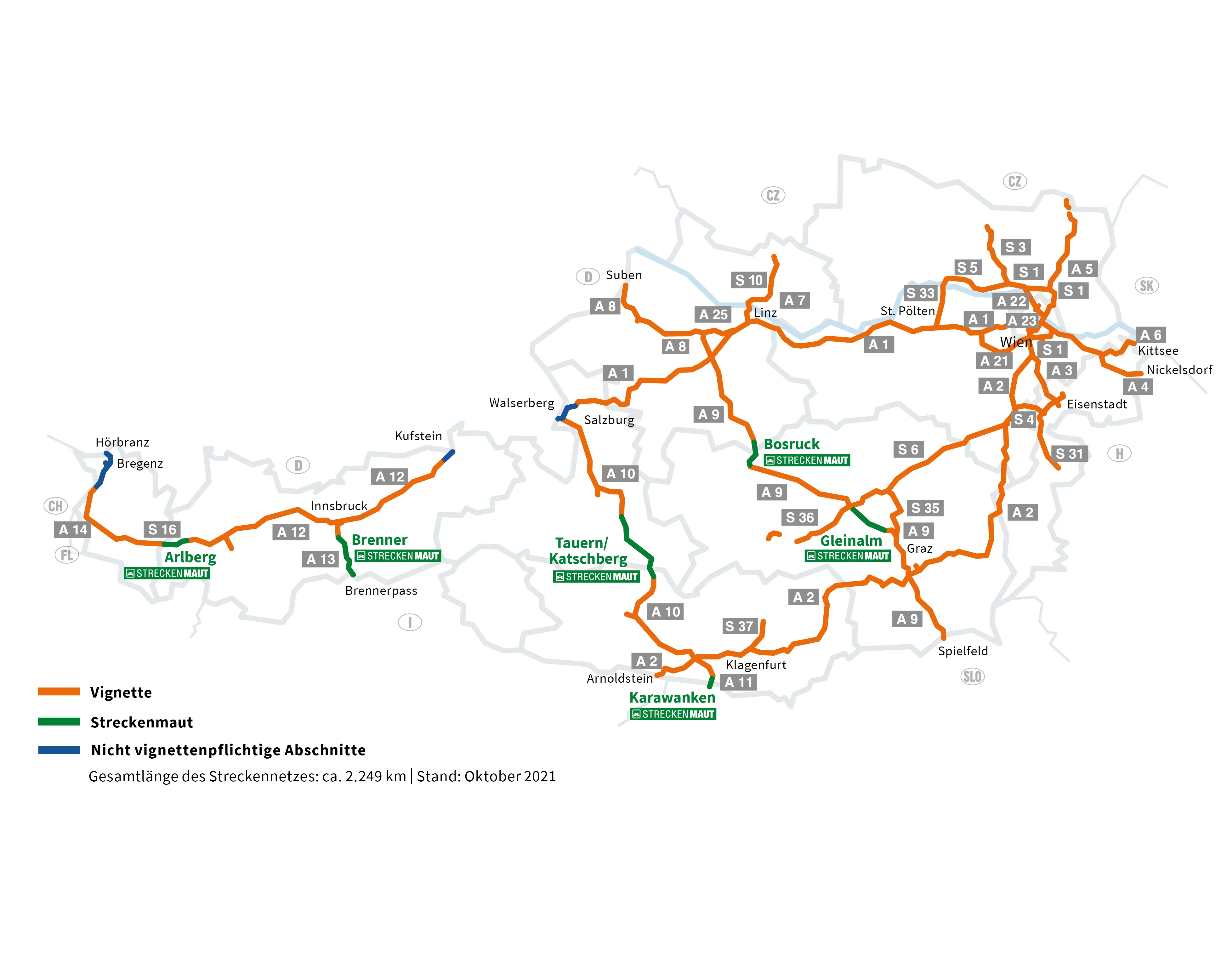 Grundsätzlich gilt für sämtliche Kraftfahrzeuge bis einschließlich 3,5 Tonnen technisch zulässiger Gesamtmasse (tGm) auf den orange eingezeichneten Autobahnen und Schnellstraßen die Mautpflicht (siehe Grafik). Keine Vignette ist zur Benutzung von besonders kostenintensiven Streckenabschnitten, der Streckenmaut, notwendig. Hier gelten gesonderte Streckenmauttarife.
