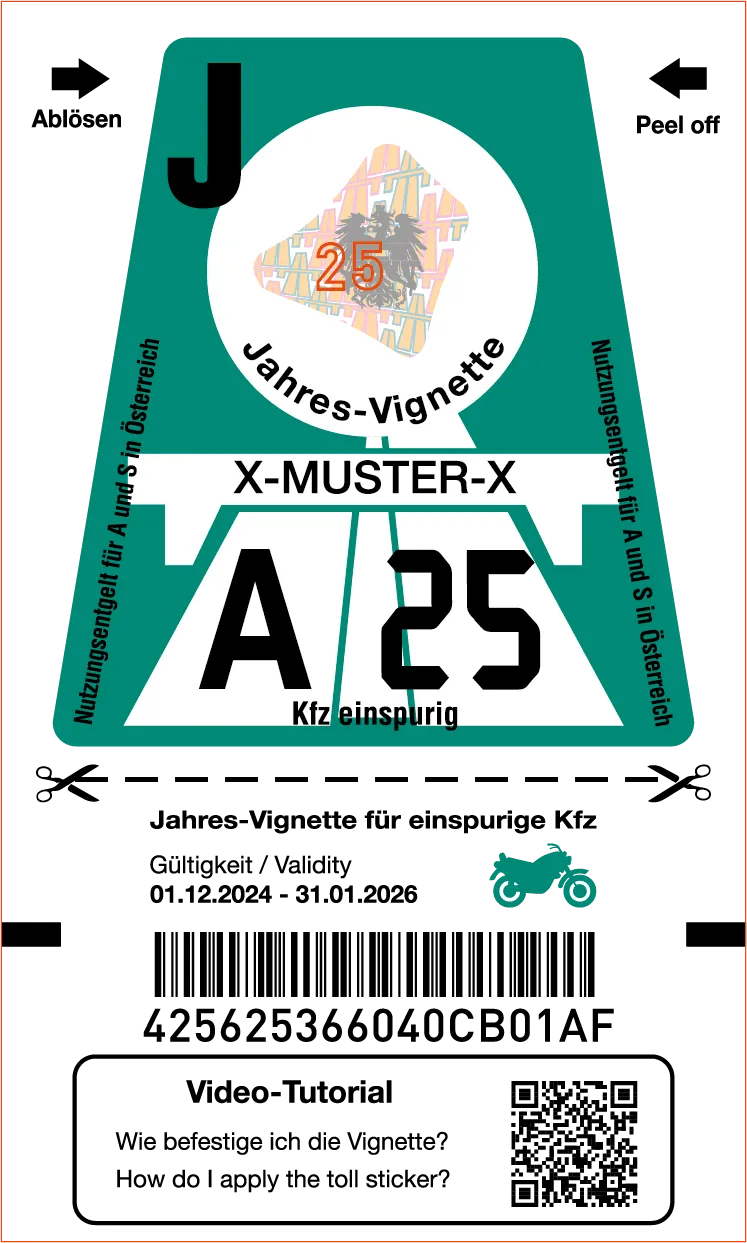 - Ebenfalls im Hologramm: Die Jahreszahl "z.B. 25" verweist auf den Gültigkeitszeitraum der Vignette vom 1. Dezember 2024 bis 31. Jänner 2026